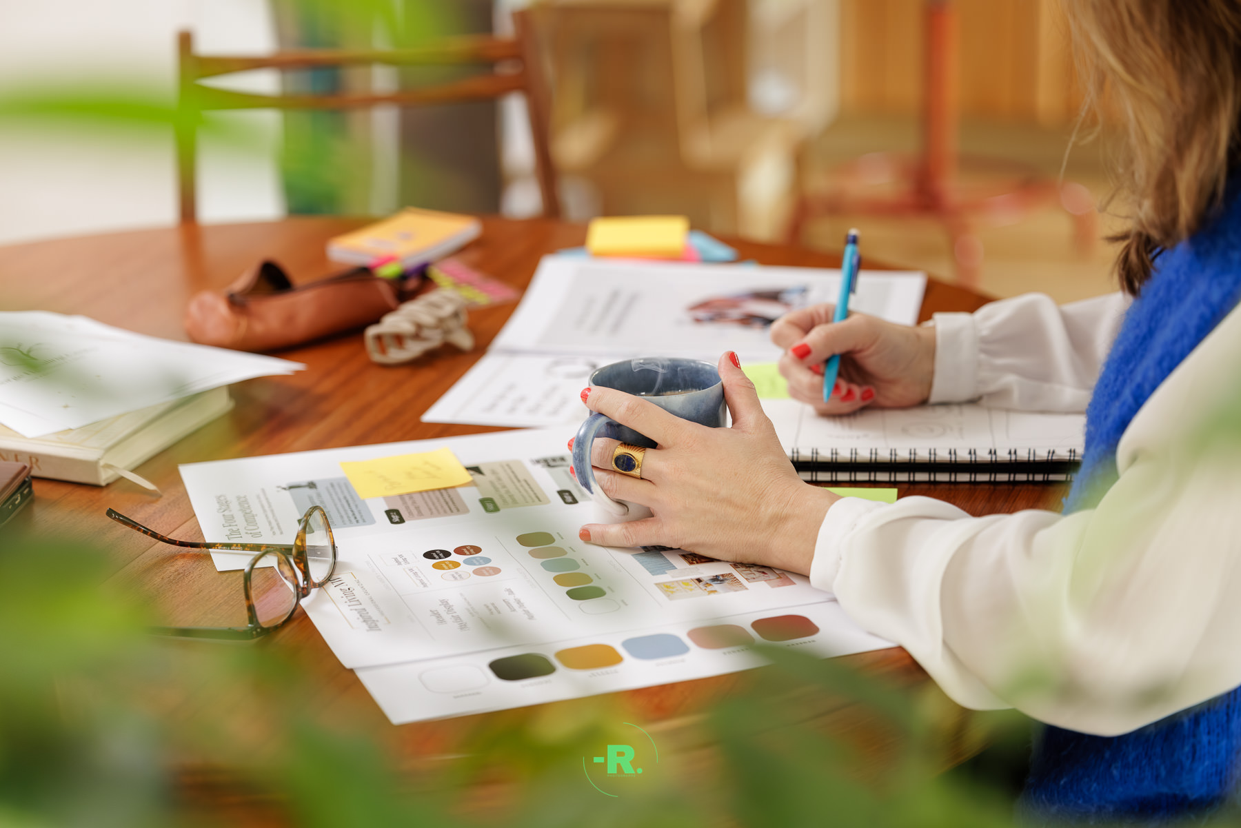 - La réflexion : Veronica avec ses carnets, un stylo, le regard porté au loin. Cela illustre la phase de stratégie.